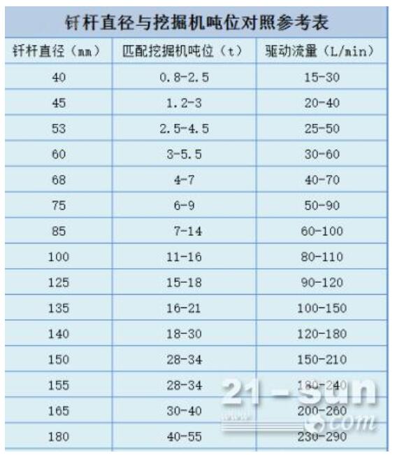 破碎锤钻杆直径不等,不同品牌之间也细分了很多型号。让我们来看看不同型号的破碎锤应该匹配什么吨位的挖掘机。